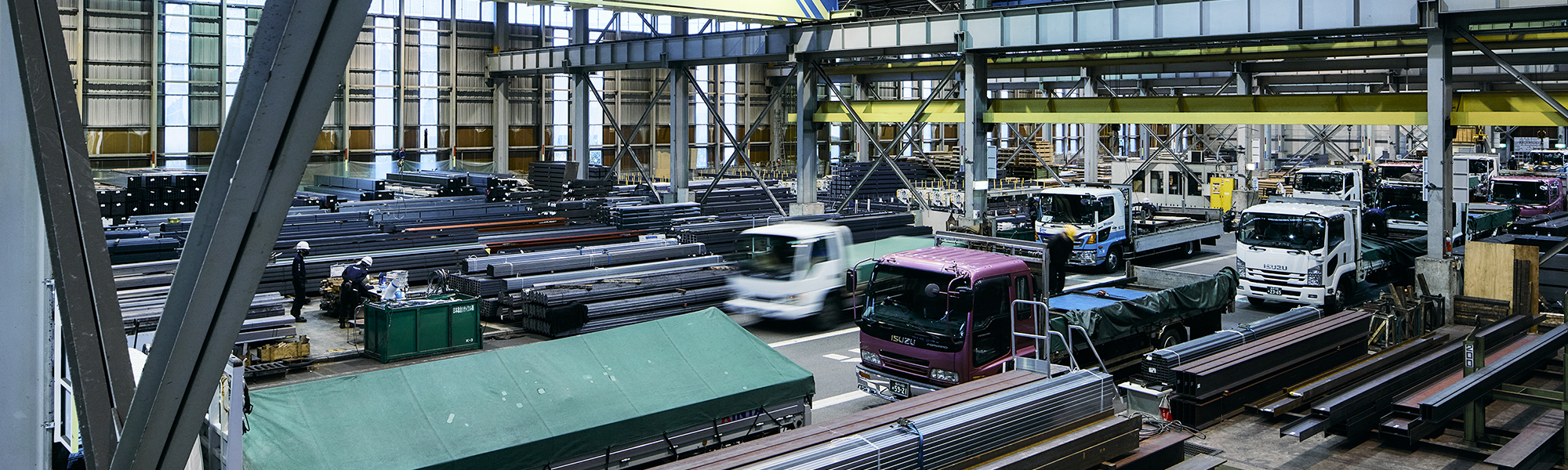 国家資格が必要な大型クレーンを操作する作業者がどんな大きな鋼材も安全・正確に管理しています。