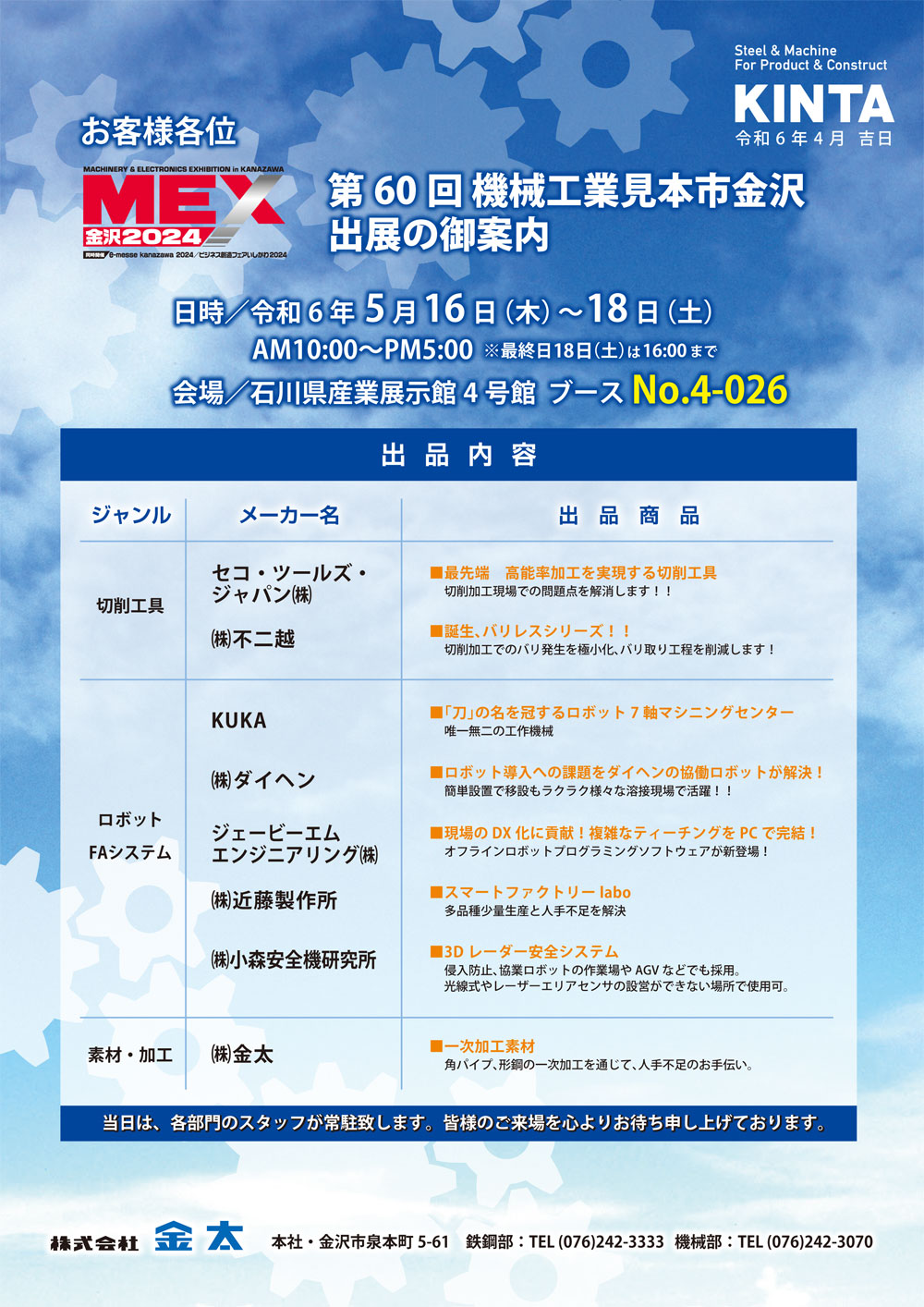 今年もいよいよやってきました!MEX金沢に今年も出展いたします! 近年の課題となっております人手不足の解消を目的とした、省人化、省力化にご協力できるような商材を多く出展します。
