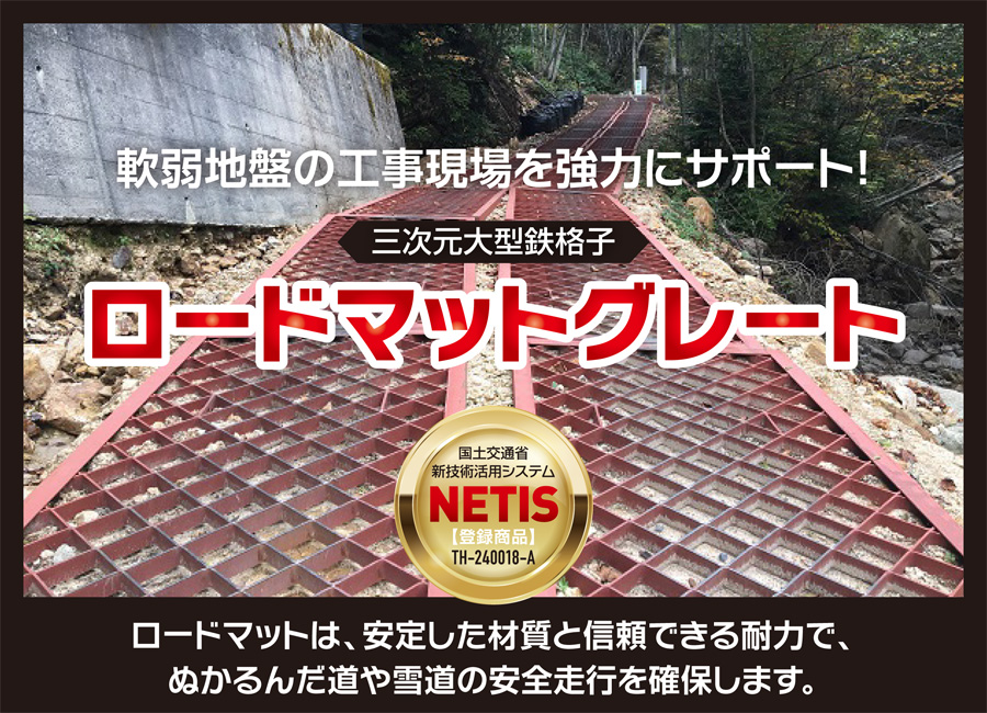 この度、兼ねてからご好評いただいております弊社製品のロードマットグレートがNETIS(新技術情報提供システムNew Technology Information System)に登録されました。