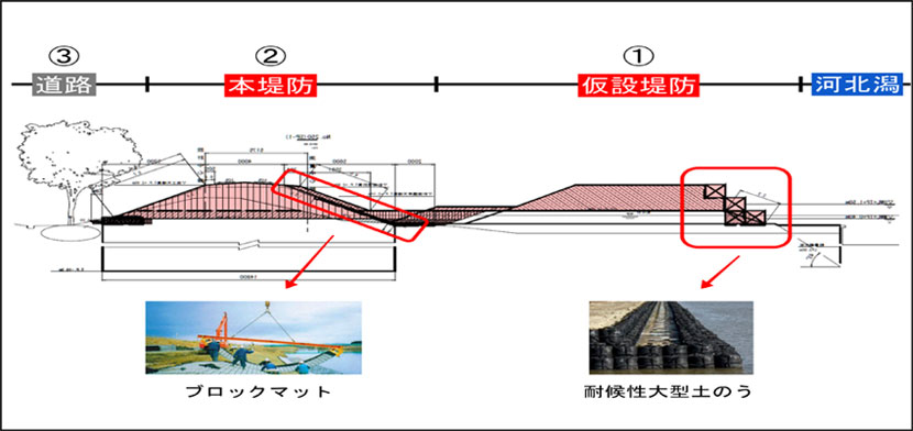 ①仮設堤防の工事が進み、現在は②本堤防の工事へと移っている段階です。